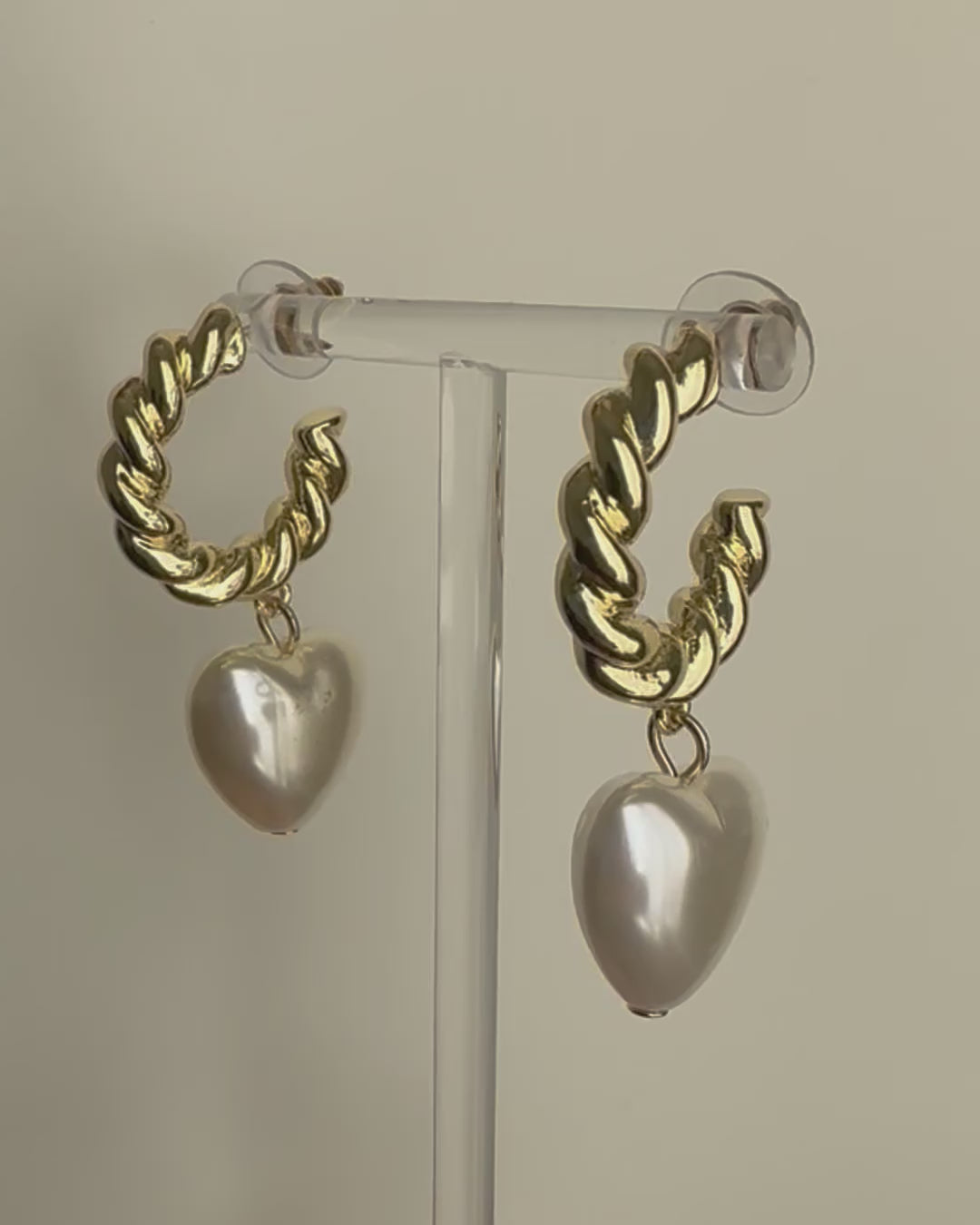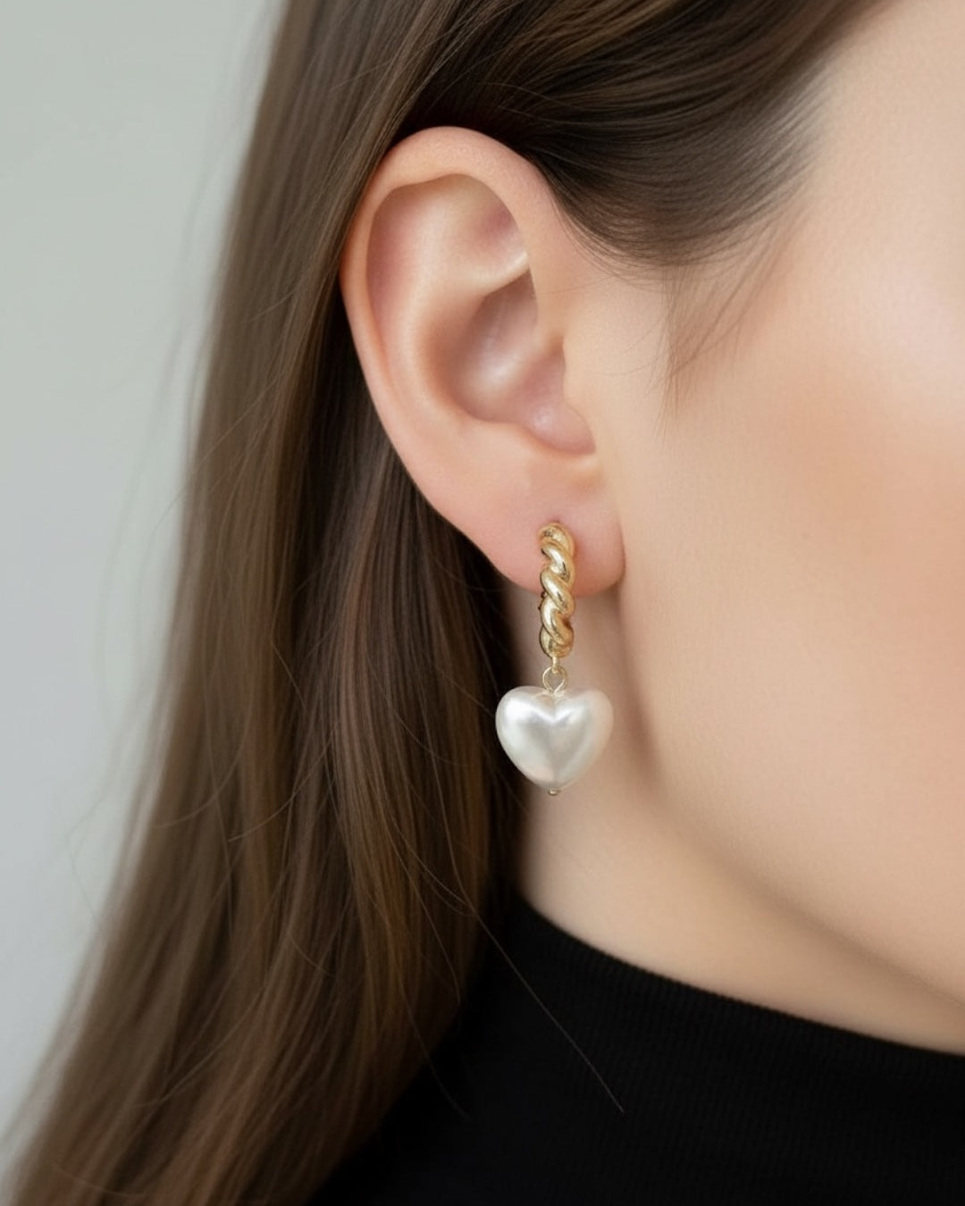 パールのハートとツイストがインパクトのあるフープピアスです