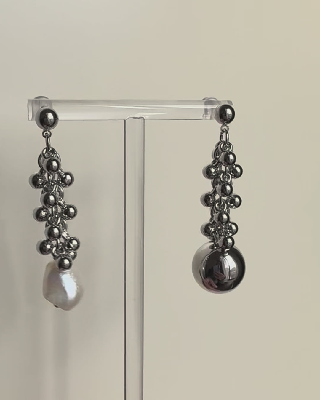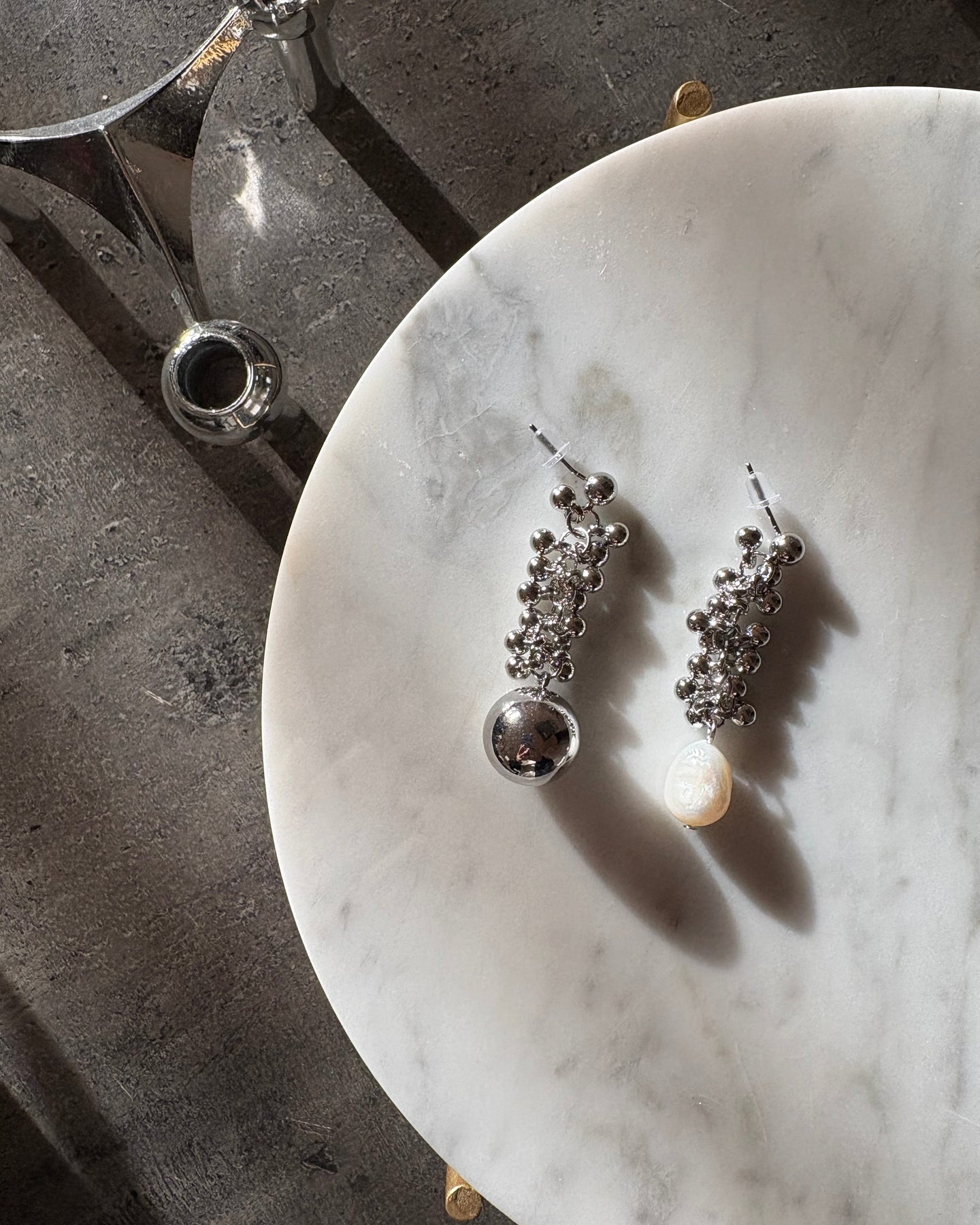粒パーツやシルバーボール、バロックパールが印象的なデザイン